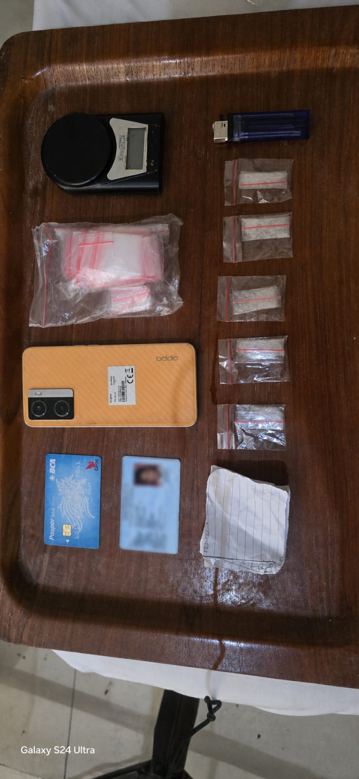 Petugas melakukan penggeledahan dengan disaksikan oleh tokoh masyarakat setempat. Selain lima paket sabu dengan berat bruto 4,02 gram, polisi juga menyita sejumlah barang bukti pendukung lainnya seperti timbangan digital, satu pak plastik klip transparan, handphone, dan korek api modifikasi.