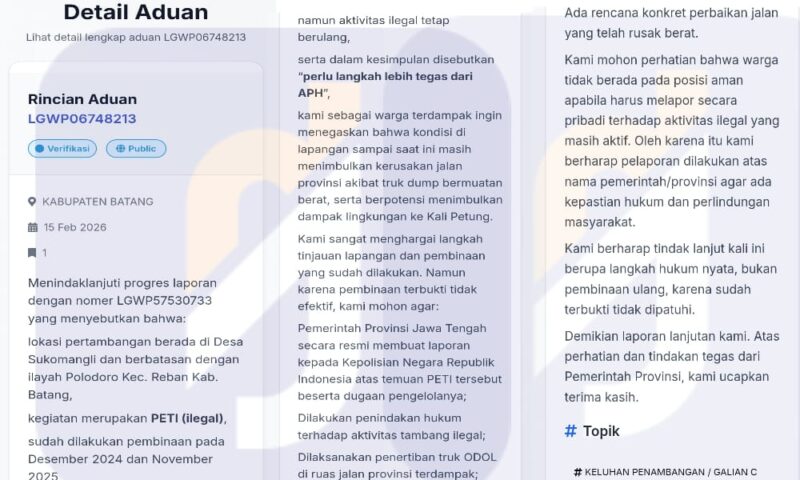 Batang, Tribuncakranews.com // Jawa Tengah – Praktik penambangan galian C ilegal Batang di wilayah Desa Sukomangli, Kecamatan Reban, kini menjadi sorotan tajam setelah warga kembali melayangkan protes keras melalui kanal aduan resmi pemerintah, Laporgub. Berdasarkan laporan bernomor LGWP06748213 tertanggal 15 Februari 2026, masyarakat mengungkapkan kekecewaan mendalam terhadap lemahnya penegakan hukum atas aktivitas tambang tanpa izin yang diduga kuat kebal hukum.