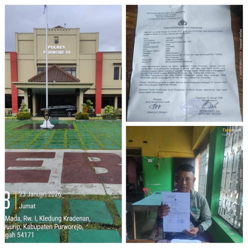 Seorang anggota BPD Desa Bendungan, Kecamatan Grabag, resmi melaporkan kasus tersebut ke Polres Purworejo pada Jumat, 23 Januari 2026, sekitar pukul 15.00 WIB.