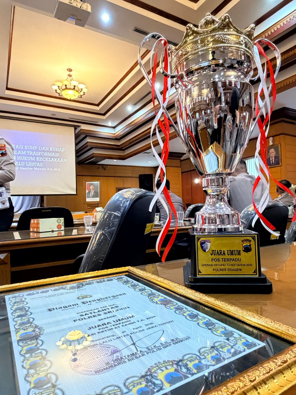 Sragen-Jateng, Tribuncakranews.com – Satuan Lalu Lintas Polres Sragen kembali menorehkan prestasi gemilang dengan meraih Juara Umum Pos Terpadu dalam gelaran Operasi Ketupat Candi Tahun Anggaran 2026 tingkat Polda Jawa Tengah. Penghargaan tersebut diserahkan pada Senin siang, 27 April 2026, di Gedung Borobudur Polda Jawa Tengah, dalam rangka kegiatan Pembinaan Teknis Bidang Registrasi dan Identifikasi (Regident) Ranmor serta Regident Pengemudi TA 2026 jajaran Polda Jawa Tengah.