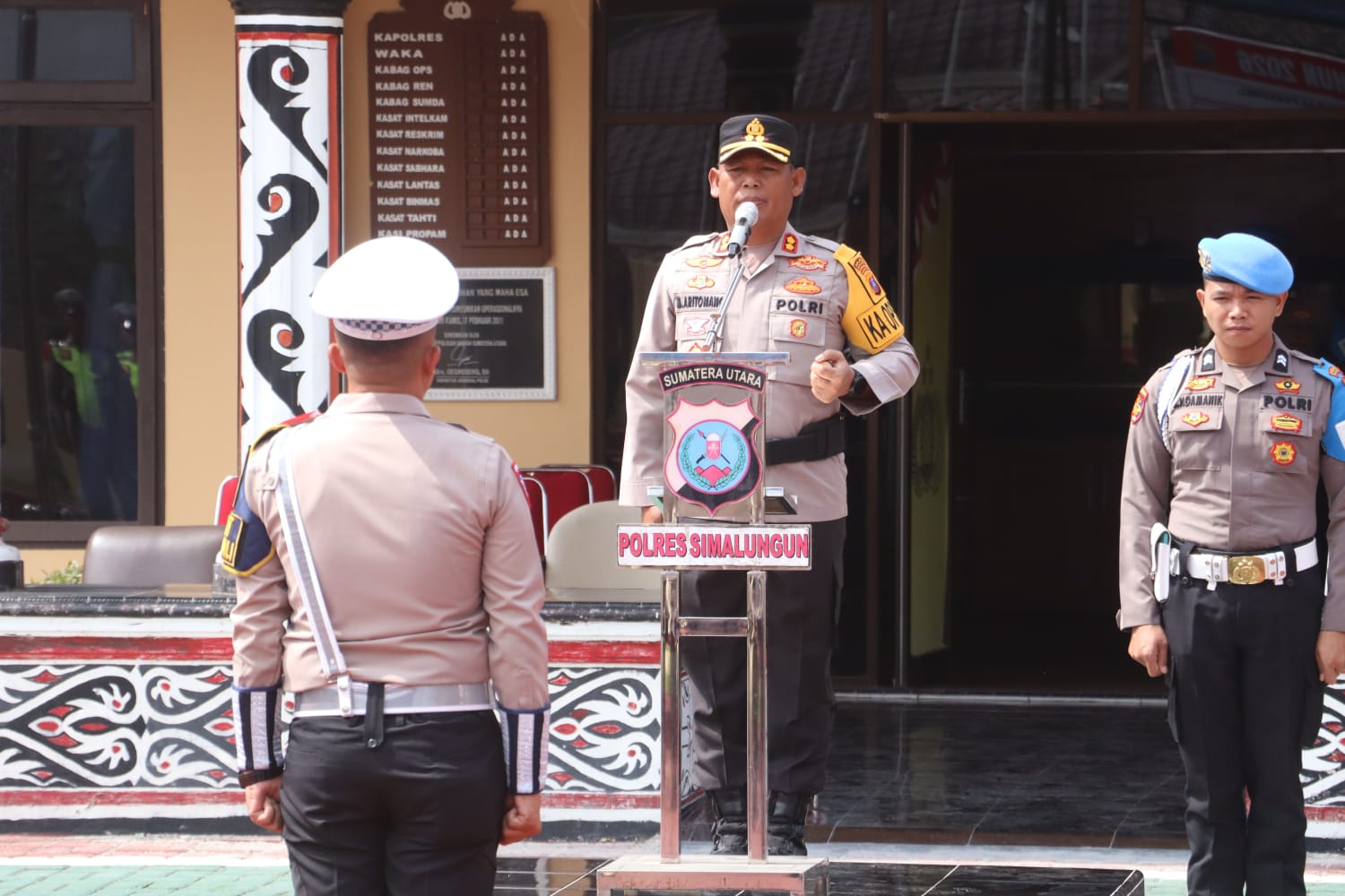 Turut hadir pula para Kasat dari berbagai satuan, termasuk Kasat Samapta AKP Heddy Marpaung, S.H., Kasat Intelkam IPTU Rido V. Pakpahan, S.Kom., M.H., Kasat Pam Obvit AKP S. Simbolon, Kasat Binmas AKP Dorlan Pasaribu, Kasat Lantas IPTU Devi Siringoringo, S.H., S.Sos., M.H., serta para kepala seksi dari berbagai bagian.