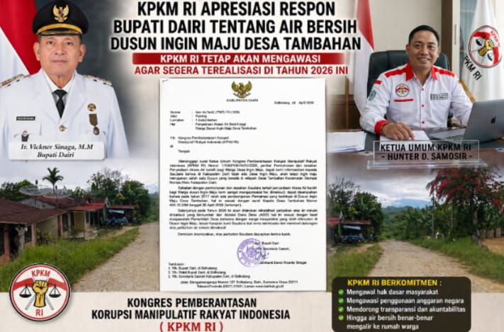 Pematangsiantar, Tribuncakranews.com 29 April 2026 – Kongres Pemberantasan Korupsi Manipulatif Rakyat Indonesia (KPKM RI) menyampaikan apresiasi atas respons cepat Pemerintah Kabupaten Dairi terhadap surat desakan terkait penyediaan akses air bersih bagi warga Dusun Ingin Maju, Desa Tambahan, Kecamatan Siempat Nempu Hulu, Kabupaten Dairi.