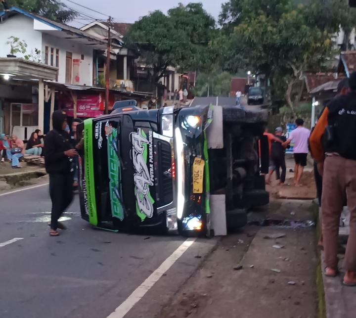 Garut, Tribuncakranews. com Mobil Elf terguling di jalur wilayah Desa Pasirlangu, Kecamatan Pakenjeng, Kabupaten Garut, Jawa Barat (Jabar), Selasa (14/4/2026) sekira pukul 5.30 WIB.