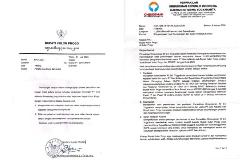 Ombudsman menilai penerbitan Surat Bupati Kulon Progo Nomor 500/2351 tertanggal 8 Juli 2025, yang memerintahkan penghentian seluruh kegiatan bisnis PT Selo Adikarto, merupakan bentuk penyimpangan prosedur sekaligus melampaui kewenangan.