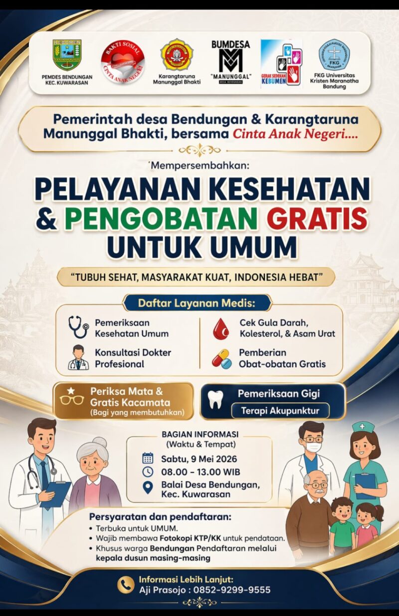 Kuwarasan Tribuncakranews. com — Semangat kepedulian sosial kembali digaungkan dari Desa Bendungan, Kecamatan Kuwarasan. Karang Taruna Manunggal Bhakti Desa Bendungan bekerja sama dengan komunitas Cinta Anak Negeri Bandung tengah mempersiapkan kegiatan pengobatan gratis yang akan dilaksanakan pada Sabtu, 09 Mei 2026 mulai pukul 08.00 WIB – selesai di Balai Desa Bendungan.