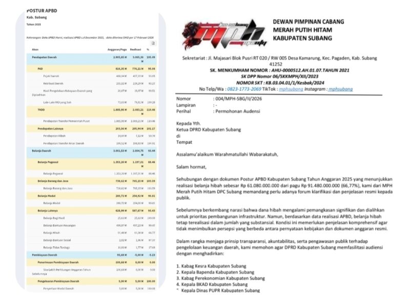 SUBANG, TRIBUNCAKRANEWS.COM – Dewan Pimpinan Cabang (DPC) Merah Putih Hitam (MPH) Kabupaten Subang secara resmi melayangkan surat permohonan audiensi kepada Ketua DPRD Kabupaten Subang pada Jumat, 20 Februari 2026. Langkah ini diambil guna meminta klarifikasi terkait realisasi belanja hibah dalam Anggaran Pendapatan dan Belanja Daerah (APBD) Tahun Anggaran 2025.