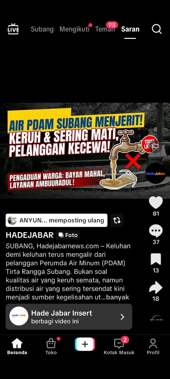 Subang, Jabar Tribuncakranews. com – Sumber dari beredarnya Tiktok Hade Jabar, Jumat 24 April 2026, 81 orang suka, dan 37 orang mengomentari. Tiktok dengan judul, Air PDAM Subang Menjerit Keruh & Sering Mati, Pelanggan Kecewa. Pengaduan warga : bayar mahal layanan amburadul!.