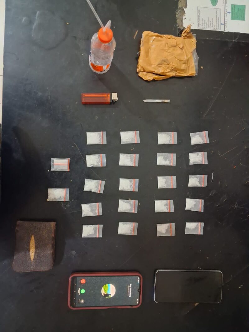 Dari hasil penggeledahan menyeluruh, petugas berhasil menyita barang bukti berupa 22 plastik klip sedang berisi narkotika jenis sabu dengan berat bruto keseluruhan mencapai 21,85 gram. Selain itu, diamankan pula barang-barang pendukung yang digunakan untuk proses transaksi maupun pemakaian, yakni 1 plastik klip besar kosong, 1 buah kaca pirex, 1 alat hisap sabu yang dirakit dari botol plastik, 1 kotak mancis berwarna merah, 1 buah dompet berwarna coklat, serta dua unit ponsel masing-masing merk Oppo berwarna hitam dan Samsung berwarna abu-abu yang diduga digunakan untuk berkomunikasi dengan pembeli.