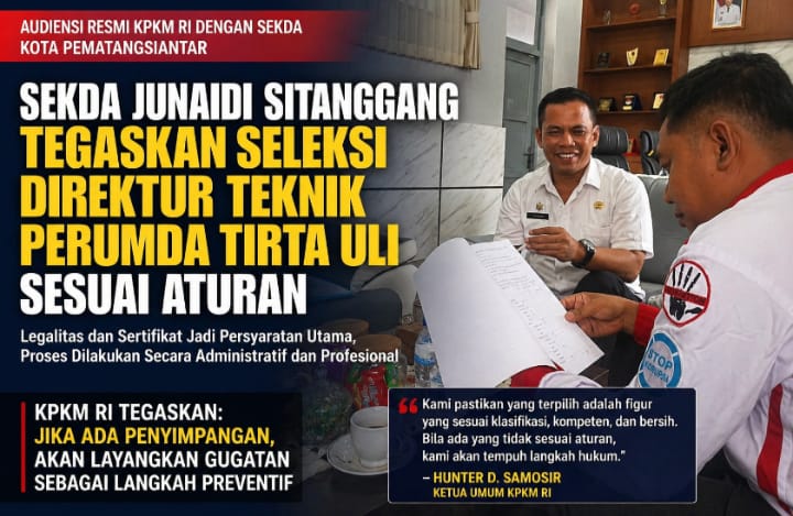 LlPematangsiantar, Tribuncakranews. com – Kongres Pemberantasan Korupsi Manipulatif Rakyat Indonesia (KPKM RI) menghadiri undangan klarifikasi dari Pemerintah Kota Pematangsiantar terkait proses Panitia Seleksi (Pansel) Calon Direktur Teknik Perusahaan Umum Daerah (Perumda) Air Minum Tirta Uli masa jabatan 2026–2031.