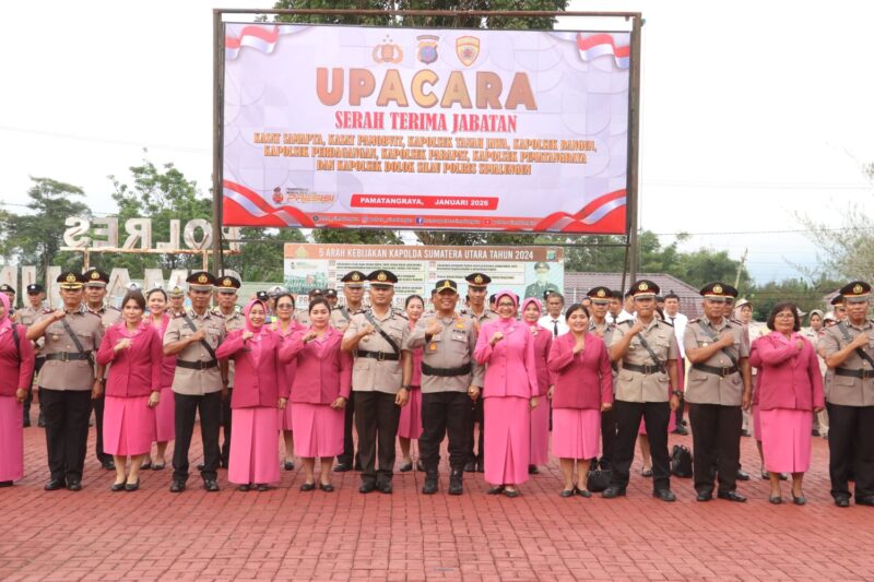 SIMALUNGUN, TRIBUNCAKRAEWS.COM – Lapangan upacara Mako Polres Simalungun di Jalan Jhon Horailam Saragih, Pamatang Raya, dipenuhi barisan pasukan yang gagah perkasa, Senin sore (19/1/2026). Kapolres Simalungun AKBP Marganda Aritonang, S.H., S.I.K., M.M., memimpin upacara serah terima jabatan (sertijab) delapan pejabat sekaligus—enam Kapolsek dan dua Kasat. Momen bersejarah ini ditandai dengan penanggalan dan penyematan tanda jabatan, pengambilan sumpah, hingga amanat yang menyentuh hati: “Jabatan adalah amanah dari Tuhan, laksanakan dengan sebaik-baiknya!”