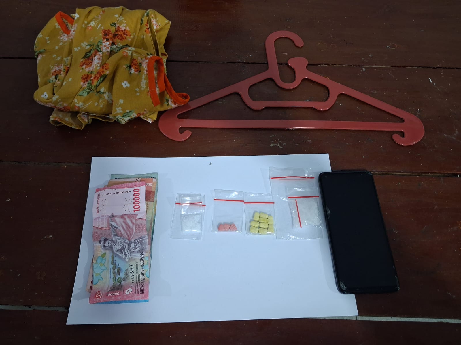 Selain narkoba, tim menyita bukti pendukung yang krusial. “Kami amankan 1 unit handphone merk Oppo warna hitam yang pasti berisi database pembeli dan pemasok, 1 buah hanger warna merah, dan uang tunai Rp600.000 yang diduga hasil jualan narkoba. Semua bukti ini akan bikin dia tidak berkutik di pengadilan,” kata IPDA Gerry.