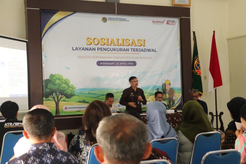 Gunungkidul (DIY), Tribuncakranews.com — Kantor Pertanahan Kabupaten Gunungkidul menyelenggarakan kegiatan Sosialisasi Layanan Pengukuran Terjadwal pada Kamis (23/4/2026) di Aula Kantor Pertanahan setempat. Kegiatan ini menjadi bagian dari upaya meningkatkan pemahaman sekaligus memperkuat sinergi antarinstansi dalam mewujudkan layanan pertanahan yang tertib, transparan, dan akuntabel.