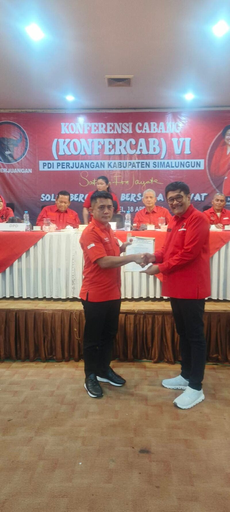 Simalungun, Tribuncakranews.com – Steven Samrin Girsang kembali terpilih sebagai Ketua PDI-Perjuangan Kabupaten Simalungun dalam Konferensi Cabang (Konfercab) yang digelar di Siantar Hotel, Sabtu (18/4/2026).