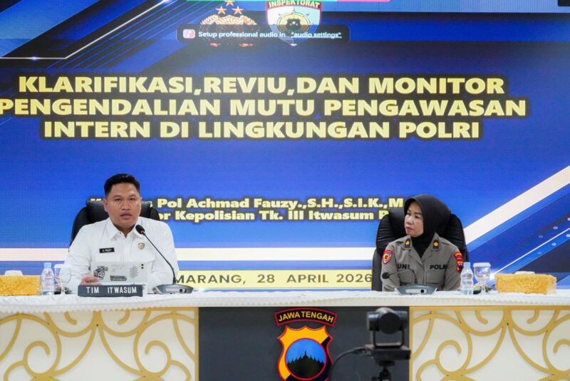 Polda Jateng-Kota Semarang, Tribuncakranews.com | Dalam rangka meningkatkan kualitas pengawasan dan akuntabilitas di lingkungan Polri, Polda Jateng menerima kunjungan Tim Itwasum Polri untuk melaksanakan kegiatan klarifikasi, reviu, dan monitoring pengendalian mutu pengawasan intern di lingkungan Polri Tahun Anggaran 2025. Kegiatan yang dilaksanakan pada Selasa, (28/4/2026) di Aula Mapolda Jateng ini bertujuan untuk memastikan bahwa proses audit dan pengawasan yang dilakukan di Polda Jateng berjalan sesuai dengan standar yang telah ditetapkan, serta memastikan kesesuaian antara temuan audit dan tindak lanjut yang diperlukan.