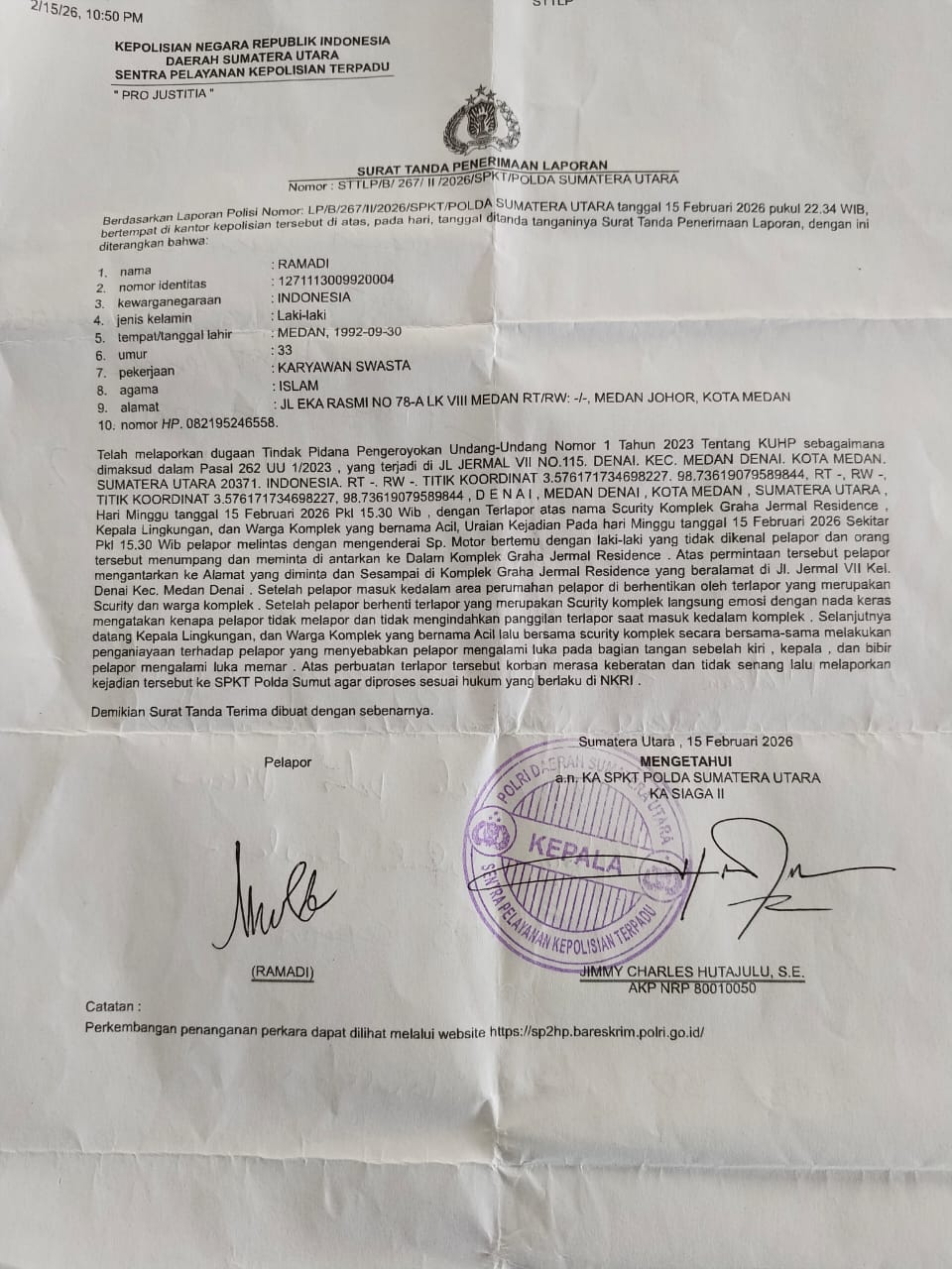 MEDAN, TRIBUNCAKRANEWS.COM // 28 FEBRUARI 2026 Video viral yang menyebut ada penyerangan oleh orang tidak dikenal (OTK) ke komplek Perumahan Graha Jermal, jalan Jermal VII, Kelurahan Denai, Kecamatan Medan Denai, pada hari Minggu tanggal 15/02/2026 lalu , serta mengklaim ada korban anak kecil berusia 6 tahun, dibantah keras oleh korban penganiayaan, Abdul Rauf dan Rahmadi kepada awak media di Stasiun Kopi jalan Tanah Merah , Medan . tanggal 28/02/2026 .