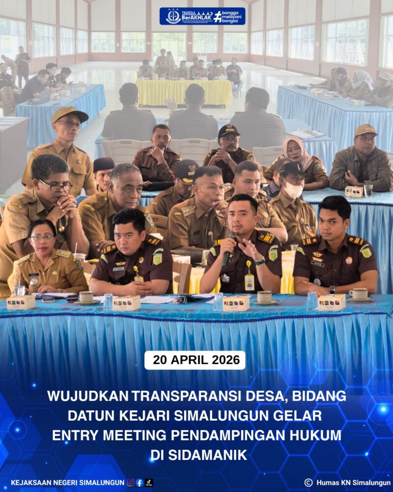 SIDAMANIK Tribuncakranews. com – Dalam komitmen memperkuat tata kelola keuangan negara di tingkat paling dasar, Kejaksaan Negeri Simalungun melalui Bidang Perdata dan Tata Usaha Negara (Datun) resmi memulai rangkaian pendampingan hukum bagi desa-desa di wilayah Kabupaten Simalungun. Agenda ini diawali dengan pelaksanaan Entry Meeting Pendampingan Hukum (Legal Assistance) Pengelolaan Anggaran Dana Desa yang bertempat di Aula Kantor Camat Sidamanik, Senin (20/4).