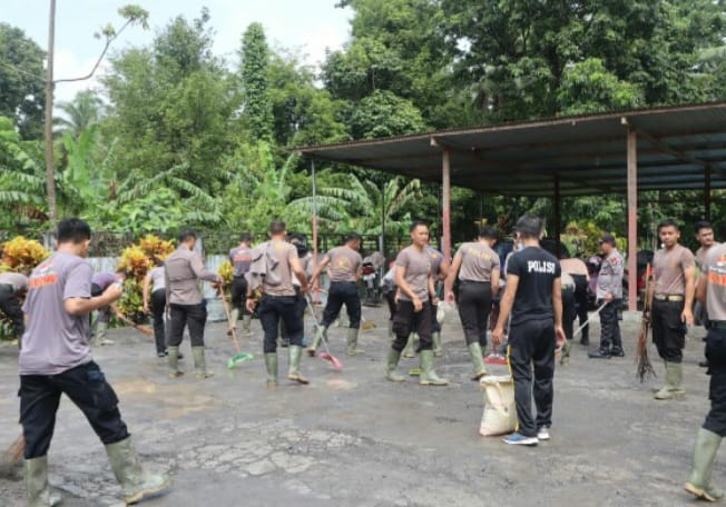 Selain personel Polres, nampak hadir juga personel Brimob, Biddokkes Polda Sulut dan personel RSUD bersama-sama melaksanakan kerja bakti.